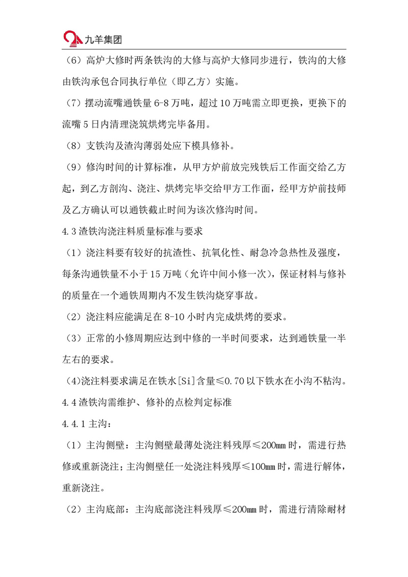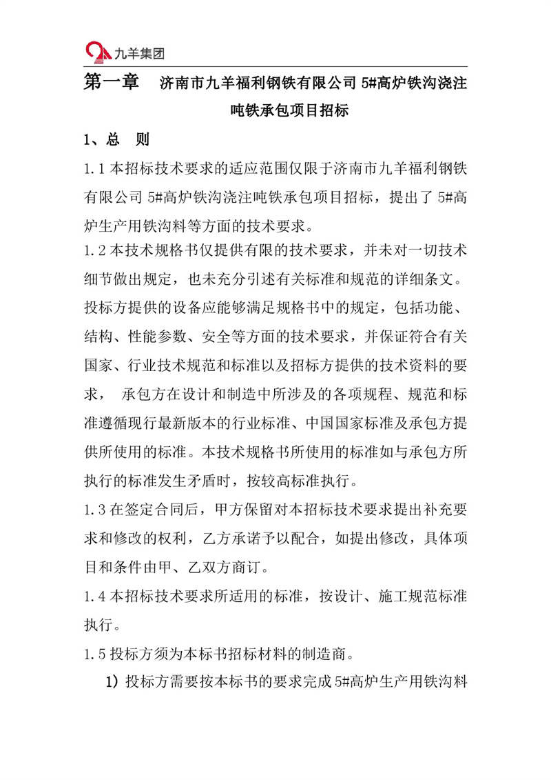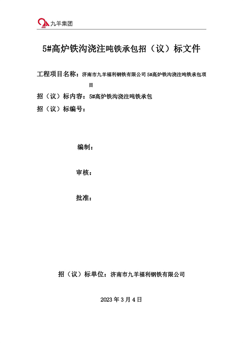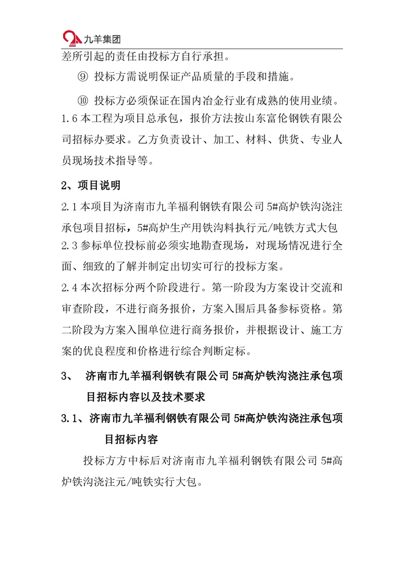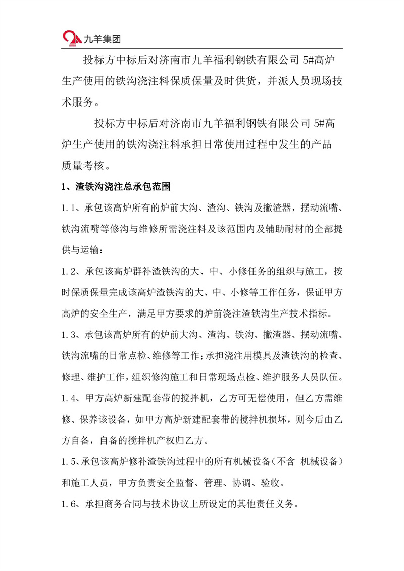 濟南市九羊福利鋼鐵有限公司5#高爐鐵溝澆注噸鐵承包項目